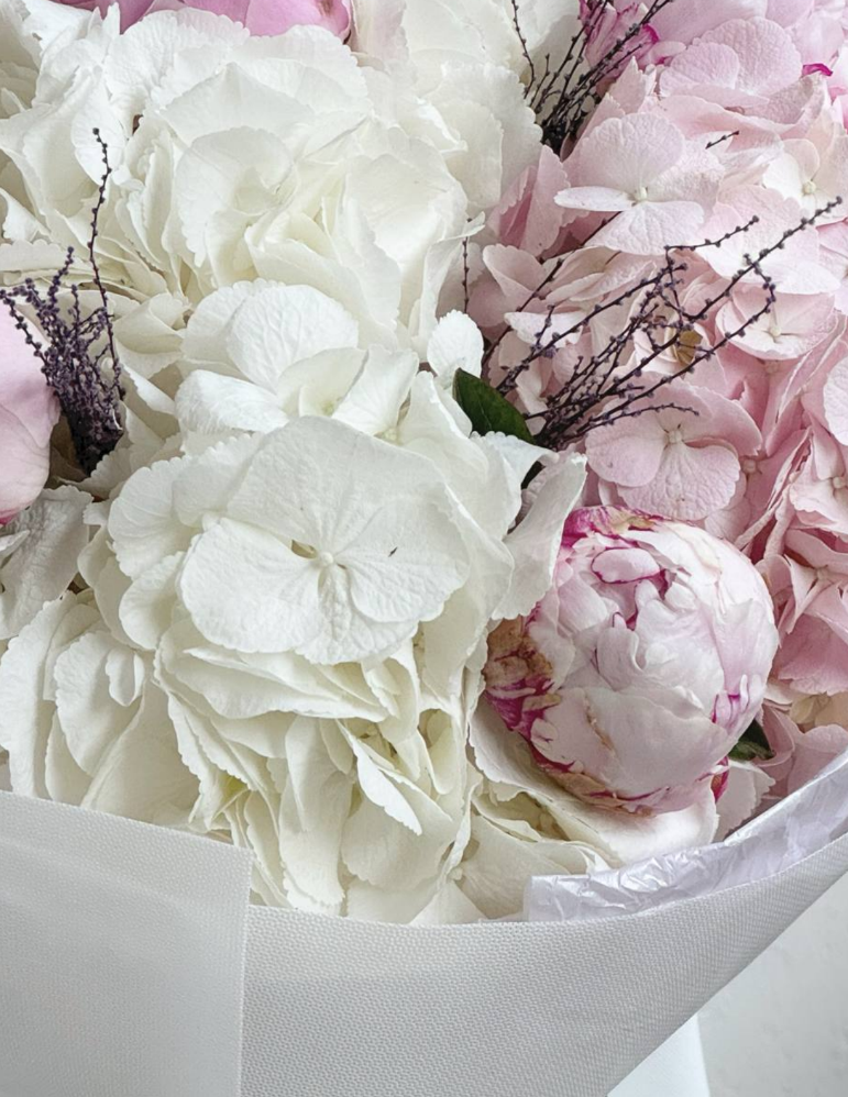 Букет «Голландский шик» — утончённая композиция из белоснежных голландских гортензий и пионов сорта Sarah. Объёмные лепестки, нежные оттенки и изысканная форма создают по-настоящему благородное впечатление. Этот букет станет роскошным подарком на свадьбу, день рождения, юбилей или признание в любви.