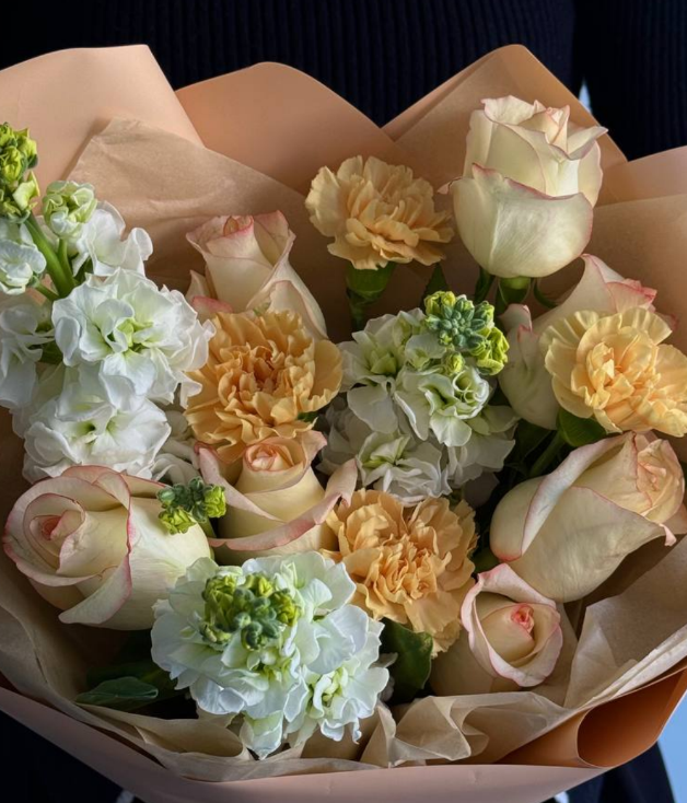 Изысканный букет в нежно-персиковой гамме из роз и маттиолы. Тёплая палитра и мягкие переходы оттенков делают композицию универсальным подарком. Цветы аккуратно оформлены в стильную упаковку с атласной лентой, что подчёркивает утончённость букета.