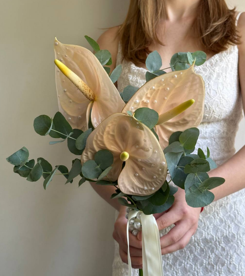 Минималистичный букет из 3-х голландских белых антуриумов. Антуриум в белом исполнении символизирует утончённость, гармонию и искренние чувства. Такой букет станет отличным выбором для свадьбы