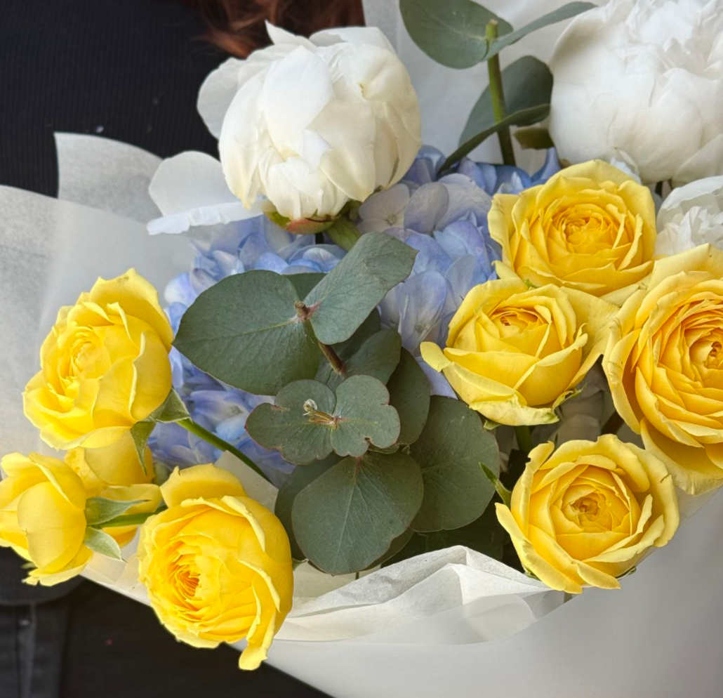 Нежный букет из 3 белых пионов, желтых розочек и голубой гортензии в сочетании с эвкалиптом. Обхват букета 30 см.