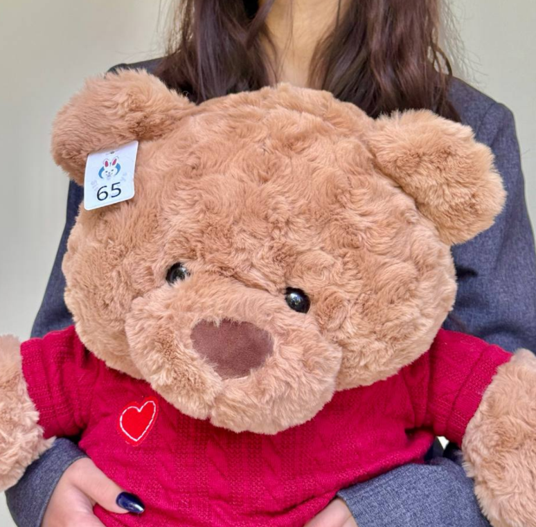 Мягкий плюшевый мишка в тёплом оттенке мокко с красным свитером. Размер 50 см.