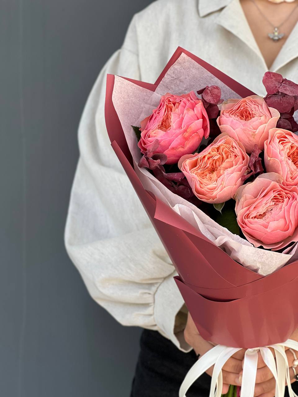 Гламурный букет из 7 пионовидных роз в розовом оттенке. Пионовидные розы считаются символом романтики и верности. Их полные бутоны отображают переполненную чувствами душу.